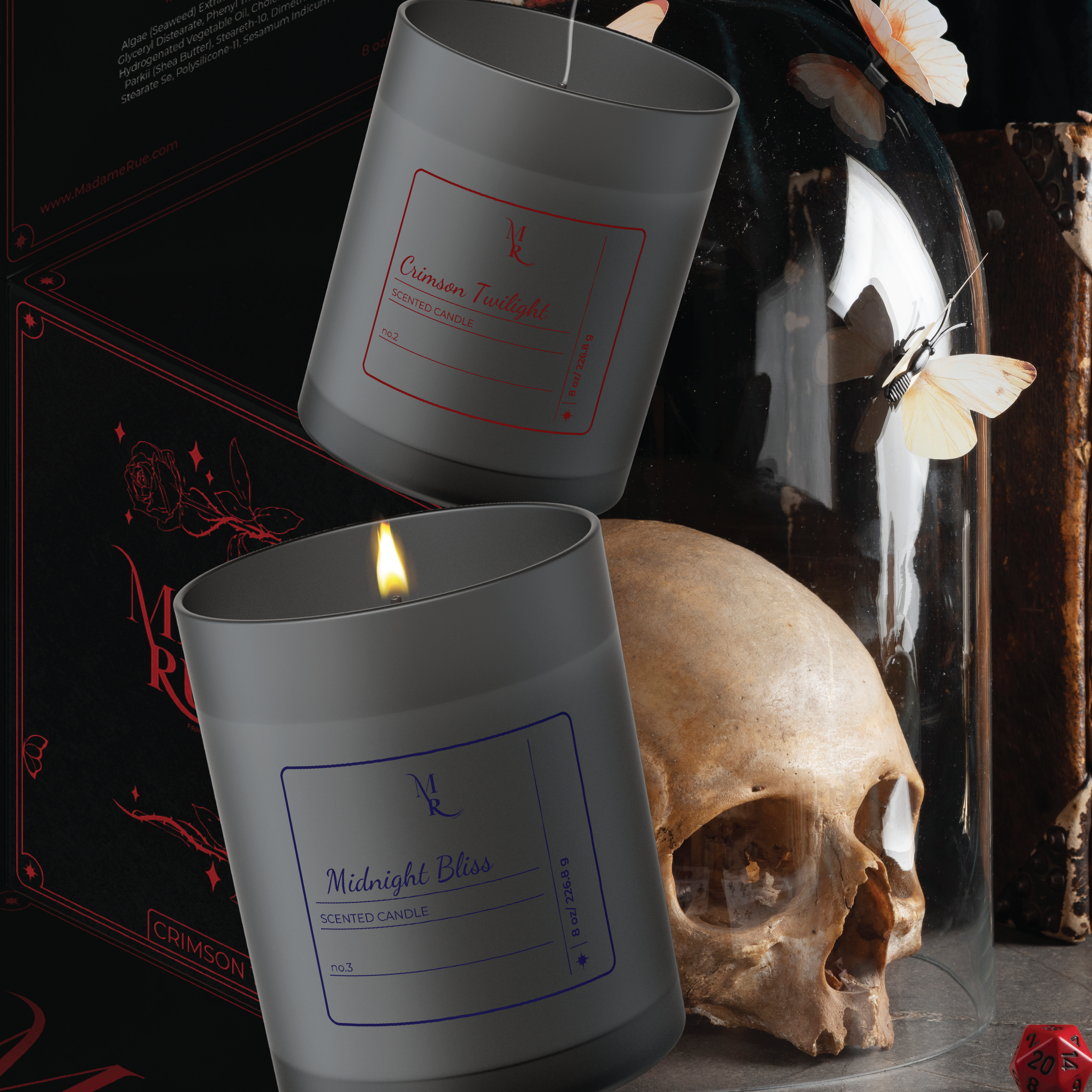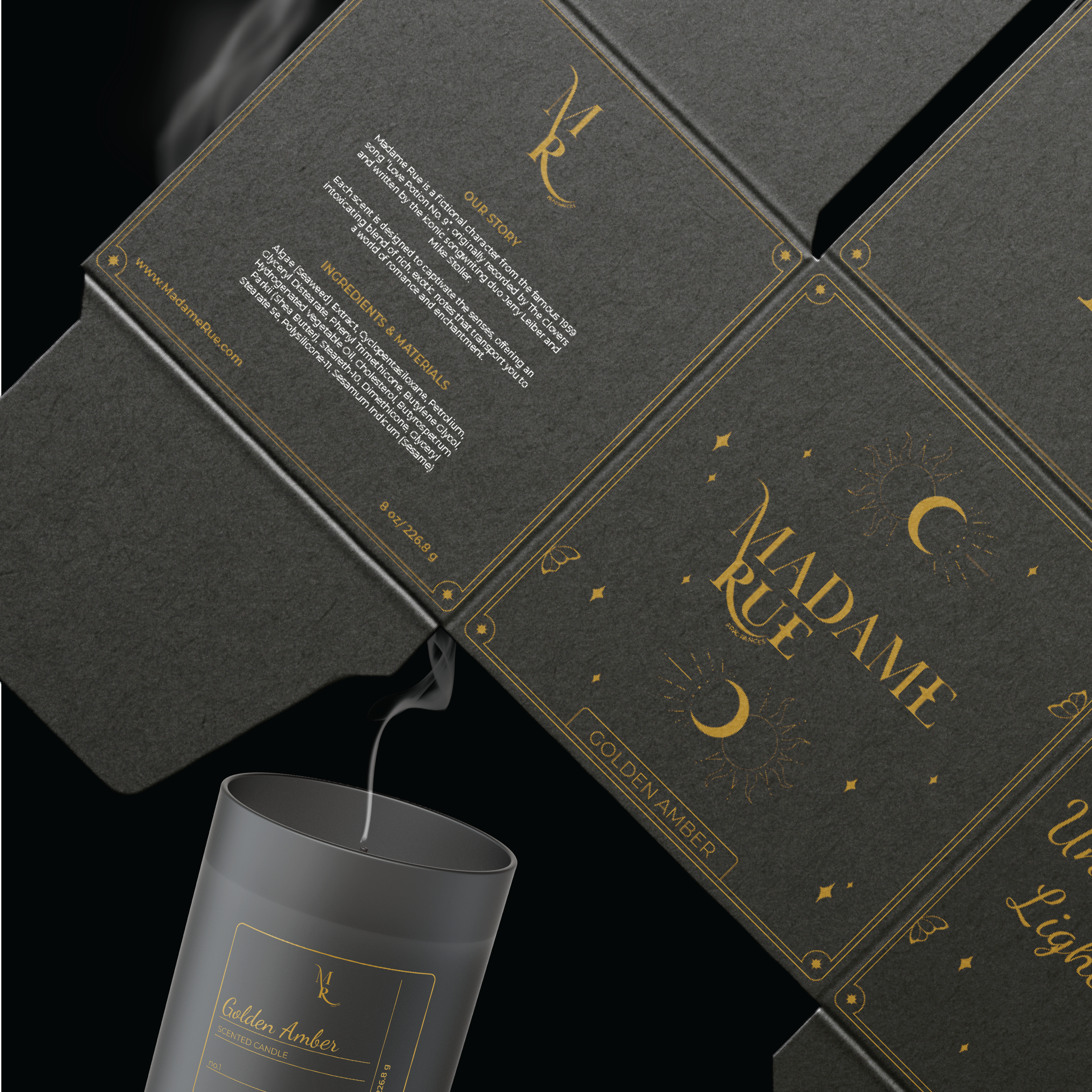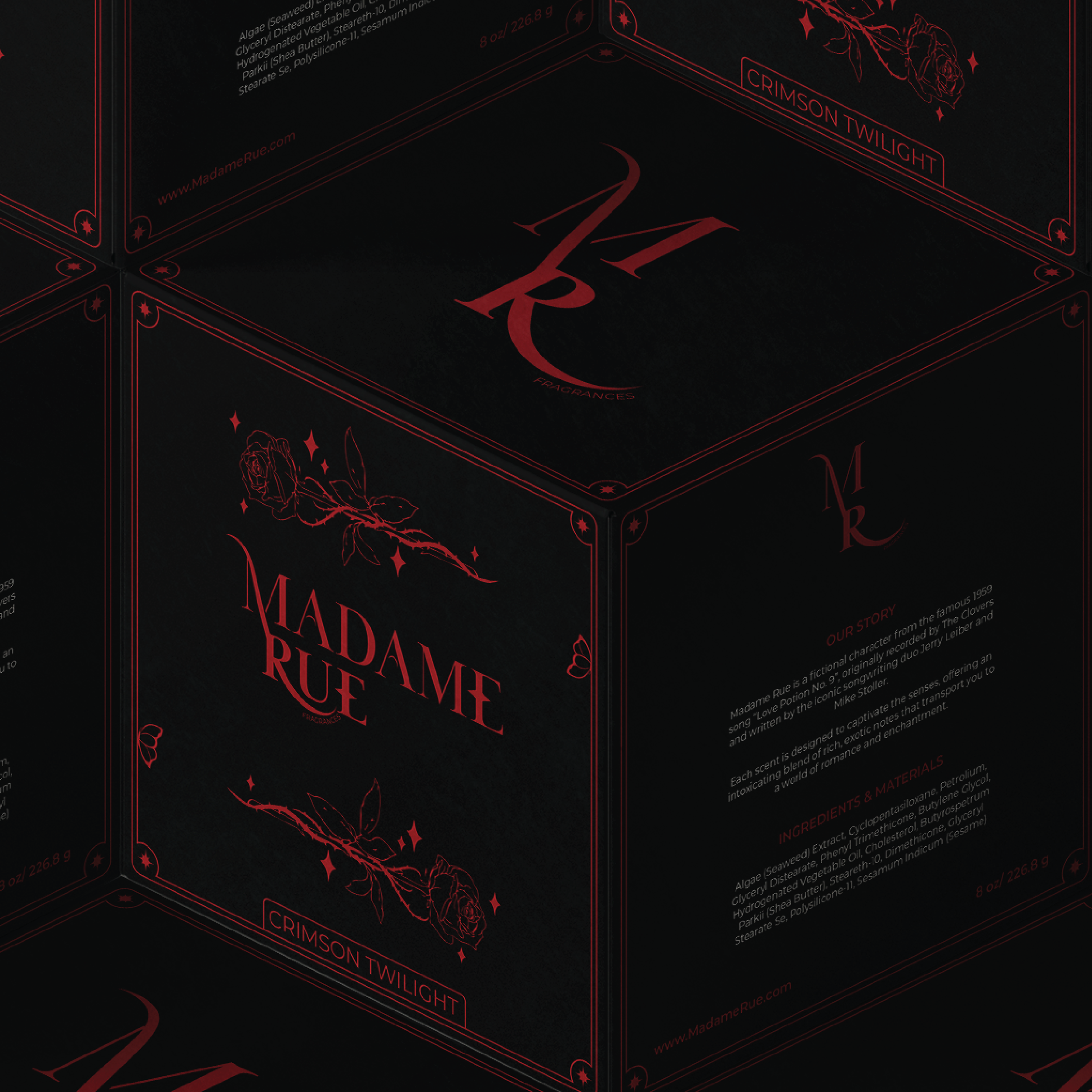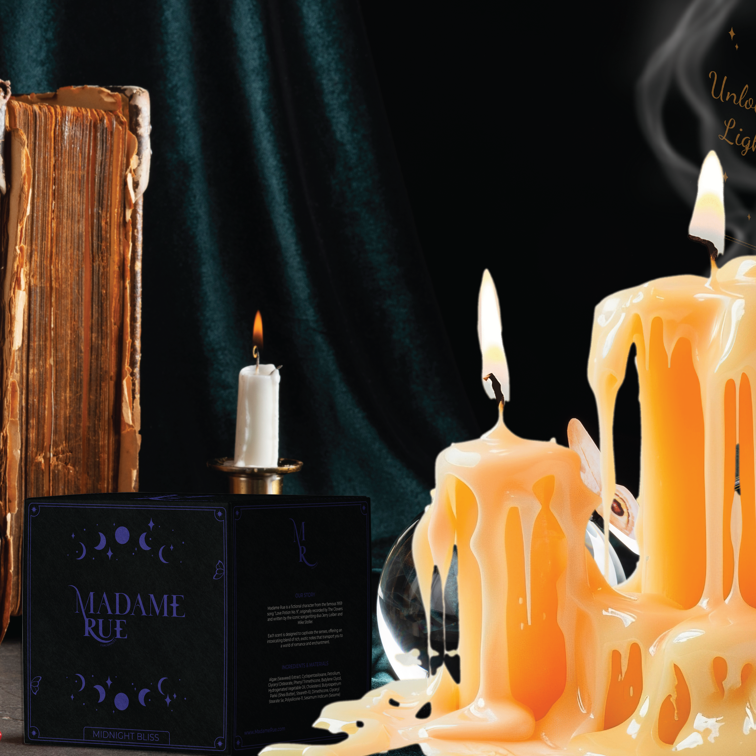 The brand should evoke a sense of mystery and intrigue, drawing customers in with the promise of something hidden and alluring. Use exotic and rare ingredients to craft fragrances that fee luxurious and otherworldly. Scents should evoke far-off places or ancient rituals, tapping into the idea that Madame Rue’s potions are made from rare, mysterious elements. Balance the dark and sesual side with a touch of playful whimsy. Think mysterious, but with a light-hearted edge. Descriptions of products and marketing materials can have a sense of fun, encouraging customers to embrace their inner mystic.