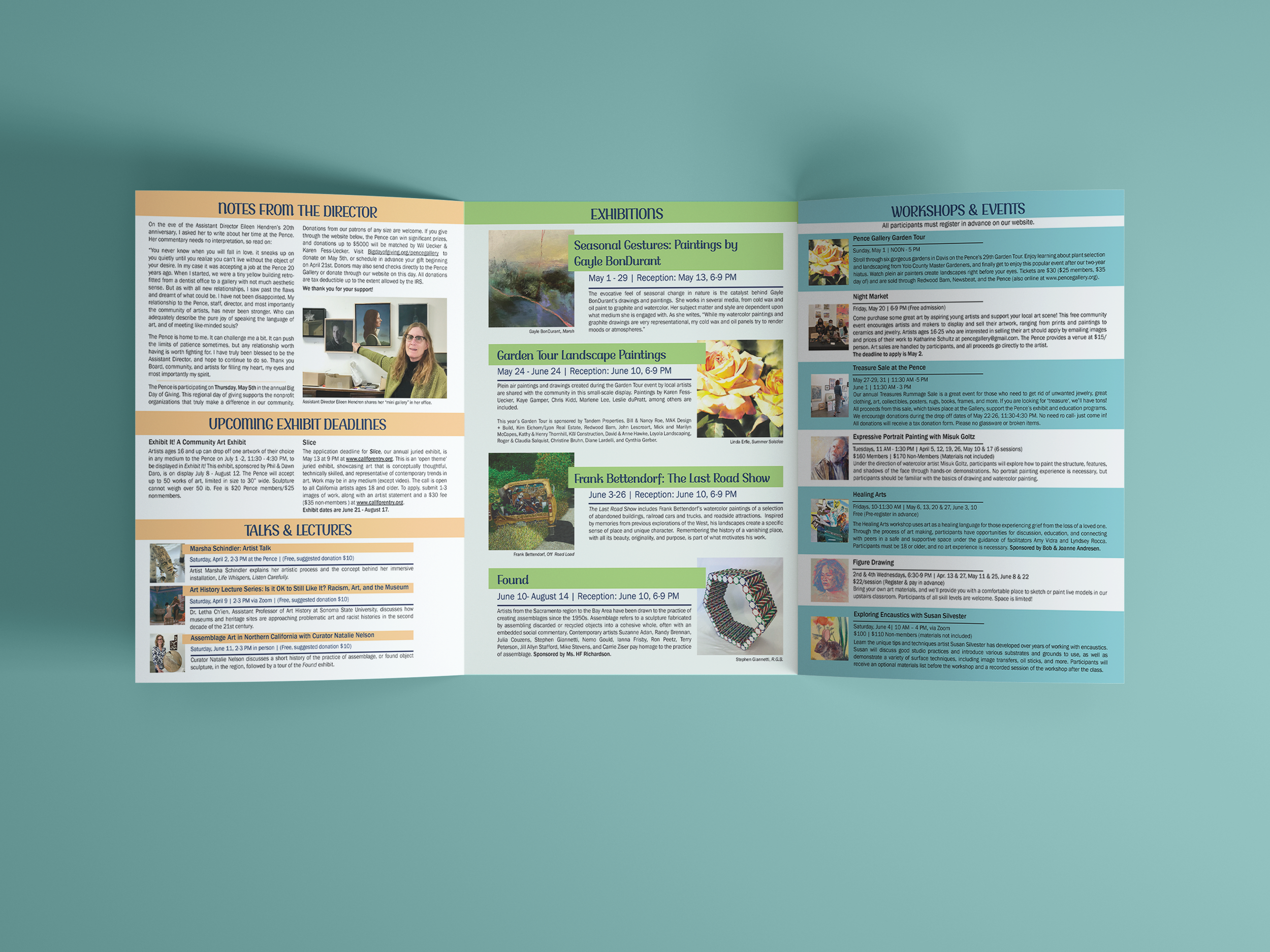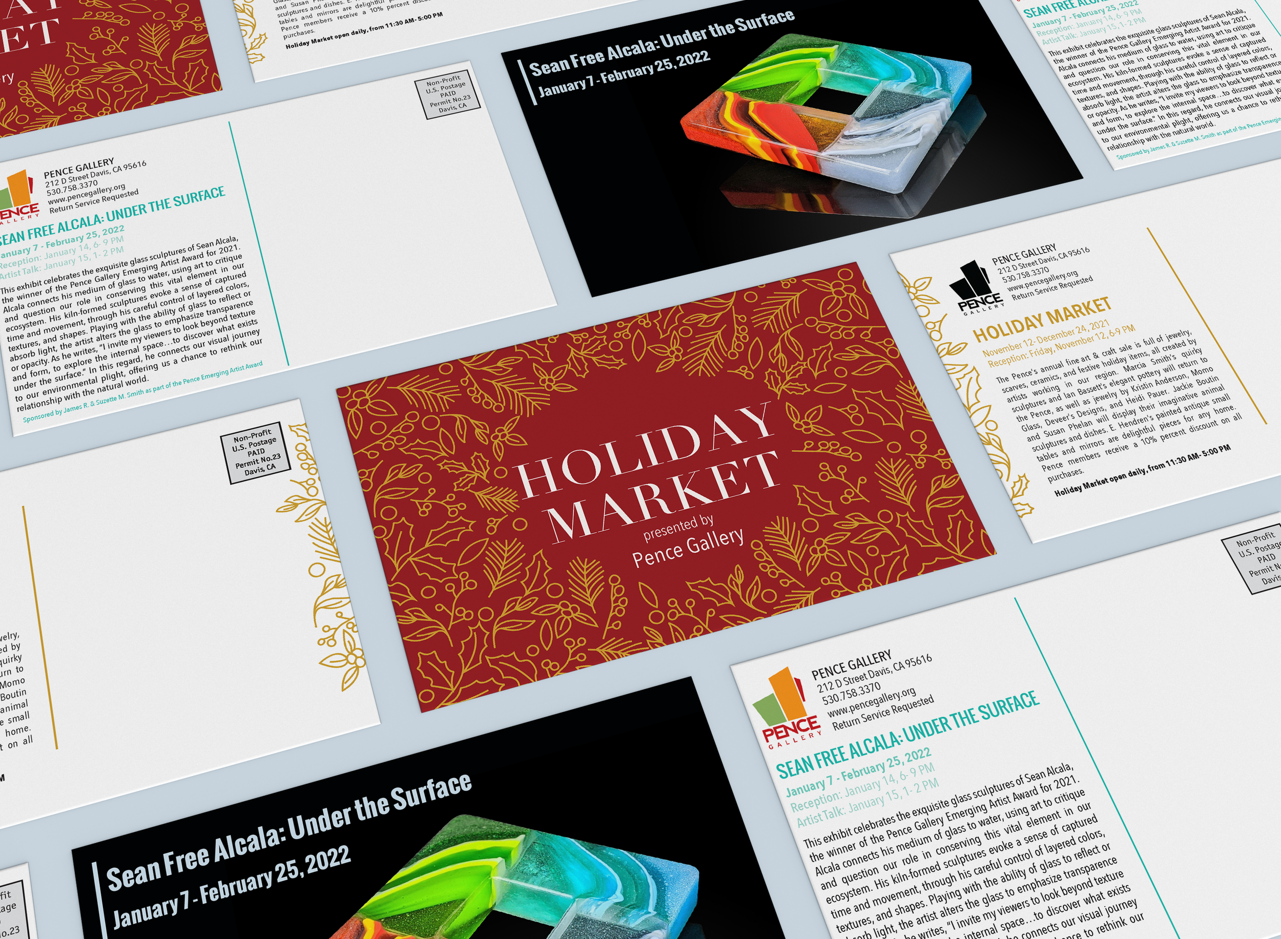 As the Graphic Designer at Pence Gallery (June 2021 – July 2022), I led the creation of digital and print graphics to promote art exhibits, events, workshops, lectures, and calls to artists. I designed a wide range of marketing materials, including postcards, newsletters, flyers, stickers, vinyl signage, booklets, social media posts, and website updates, ensuring cohesive branding and timely delivery of high-quality assets. I also created engaging graphics for social media campaigns, such as Facebook ads and Instagram posts, to enhance audience engagement. Additionally, I played a key role in managing and constructing the gallery’s new website, while providing exceptional customer service by assisting visitors and sharing information about exhibitions.