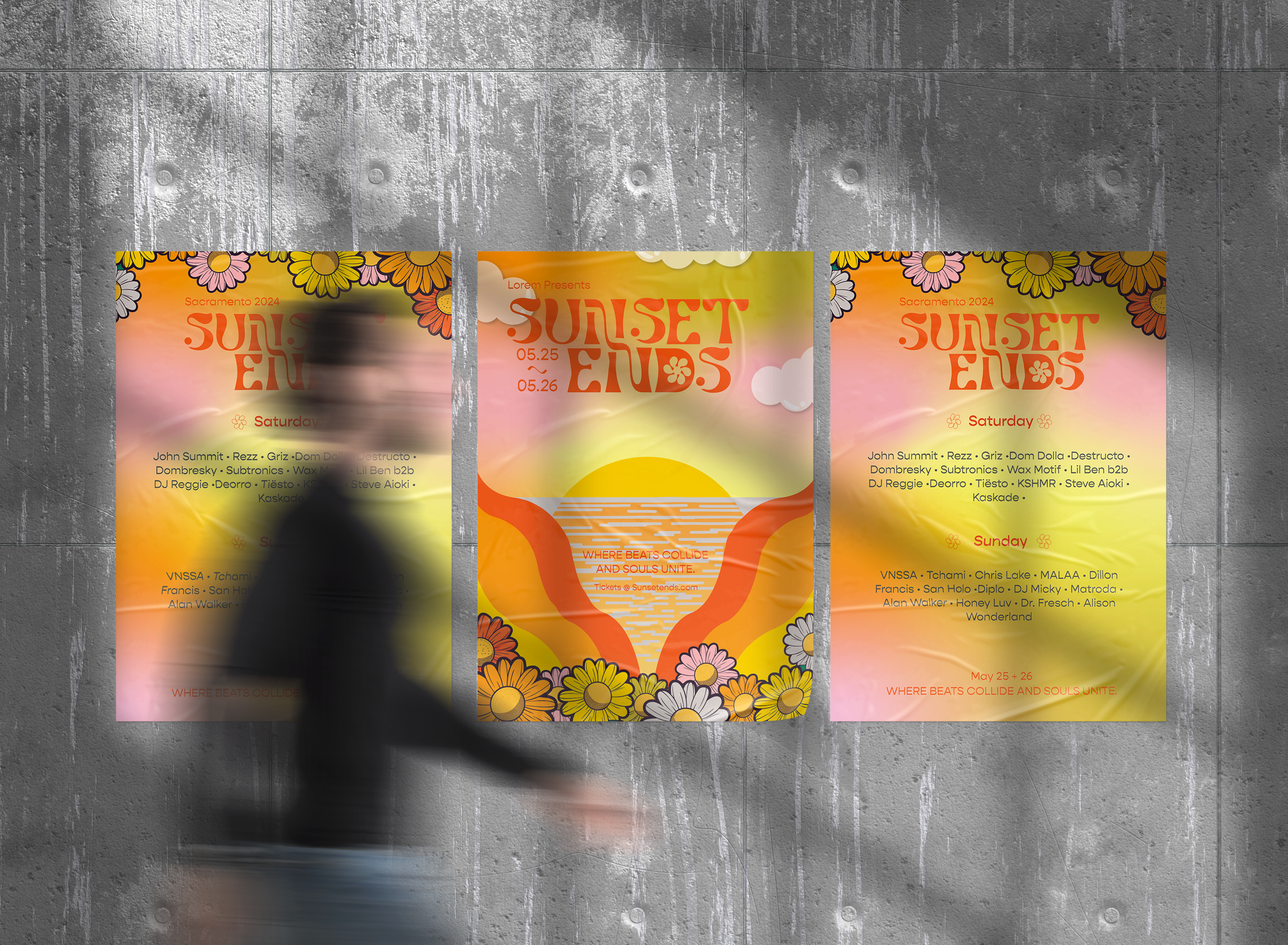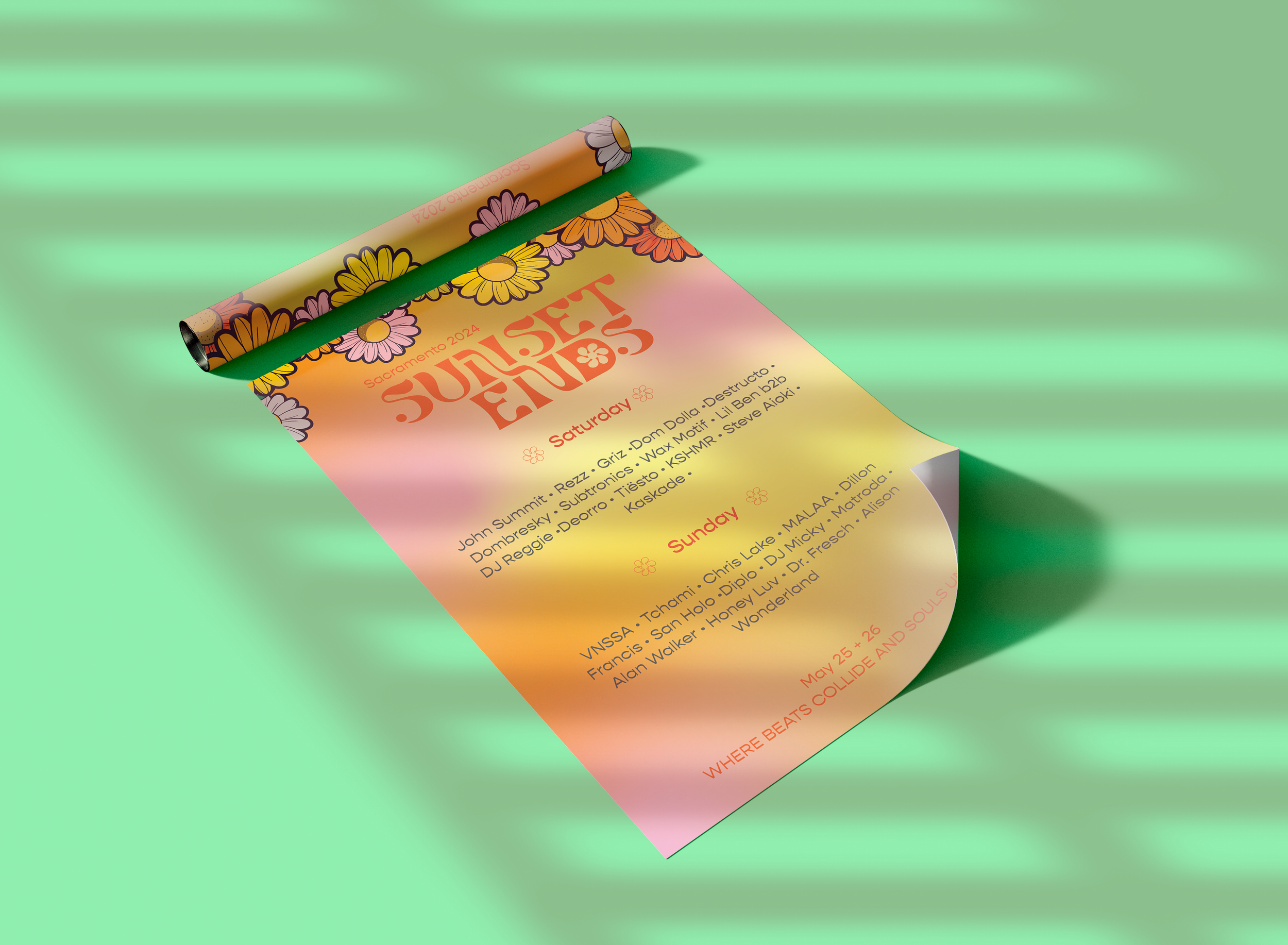 The brief for this project was to create my ideal Festival with an objective, goals, strategic considerations, personality, impact, and style & layout. Sunset Ends, is a new festival coming to Sacramento, CA that will celebrate live music from not only the biggest names but also give a platform to up and coming artists and DJ’s. This festival will aim to bring those who love dance music together once a year, to witness an unforgettable experience together. The aim for Sunset Ends is to attract hundreds of thousands every year seeking to party to the finest names in dance music along with immersive visuals, lighting, and of course a good time by the river. We want to shape the dance scene as we know it and capture the essence and qualities Sacramento has to offer.